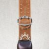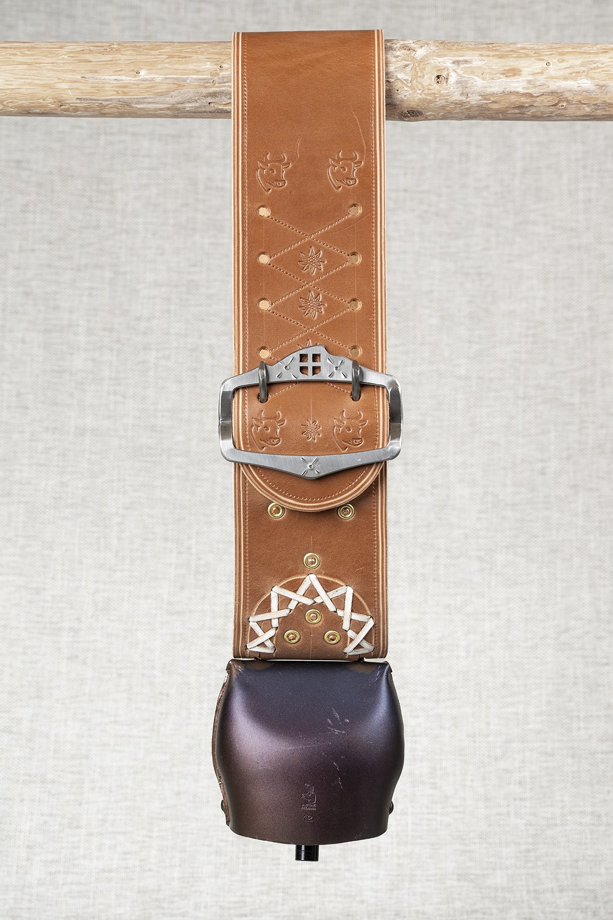 Sonnette Chamonix n°12 Taille: Hauteur: 14,3 cm Largeur: 14,1 cm Profondeur: 9,8 cm. Boucle artisanale de 12 cm en fer plat d’une épaisseur de 0,5 cm et son collier en cuir de bourrellerie en tannage végétal d’une épaisseur de 0,5 cm et de couleur noisette. Un montage savoyard avec sa couture main en lagnière parcheminée, le renfort intérieur et la boucle sont fixés avec des rivets en cuivre et rondelles laiton pour une plus grande solidité.