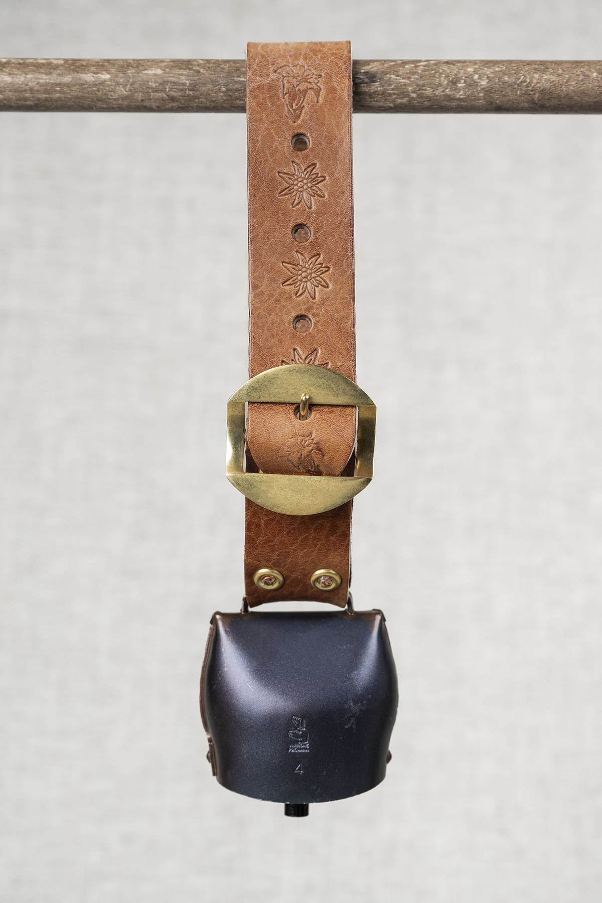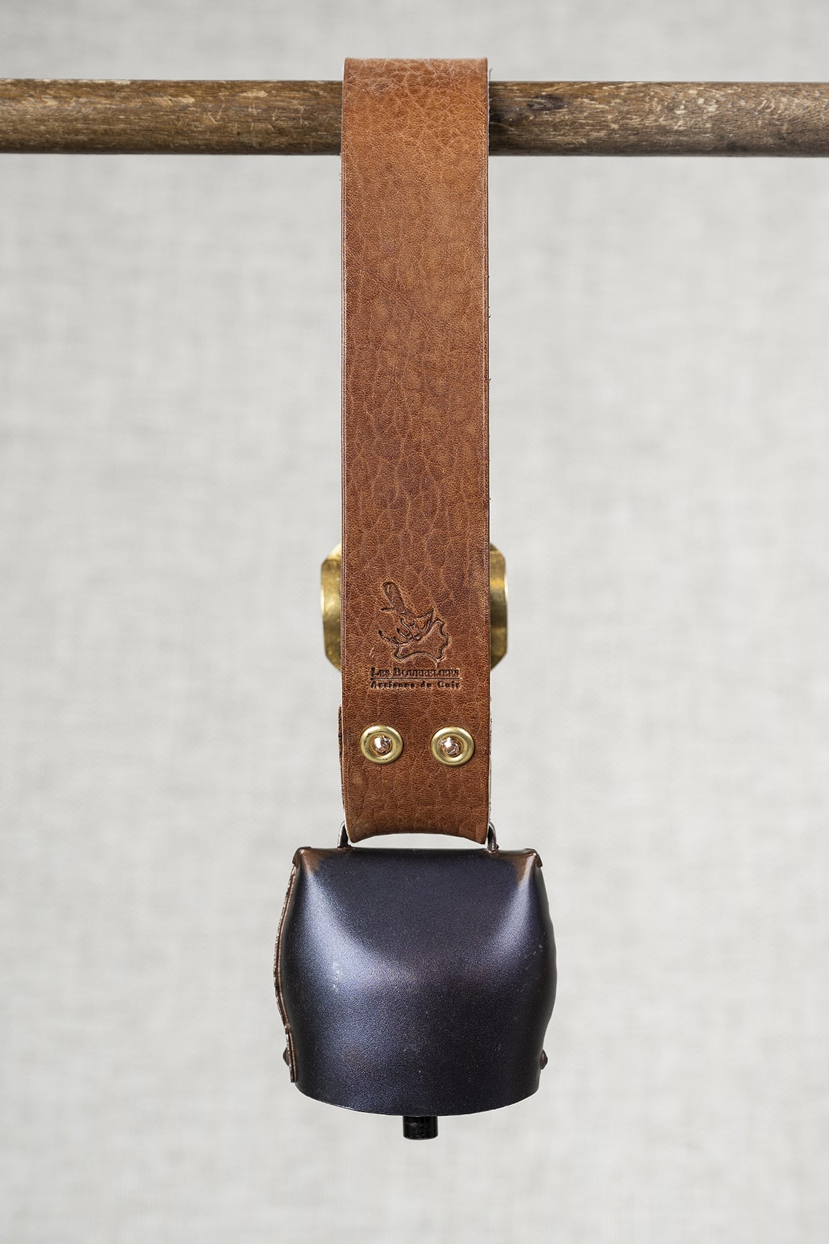 La boucle et la sonnette sont fixées avec des rivets cuivre et rondelles laiton pour une plus grande solidité.