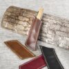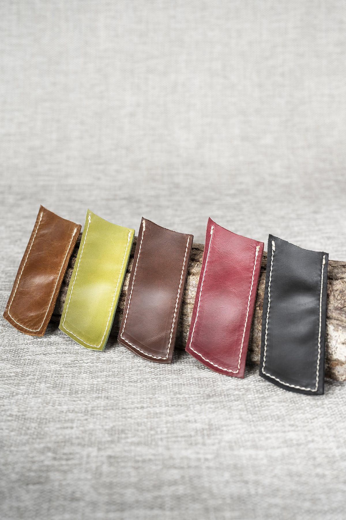 Etui en cuir fin, disponible en vert, lie de vin, noir, marron foncé et marron clair.