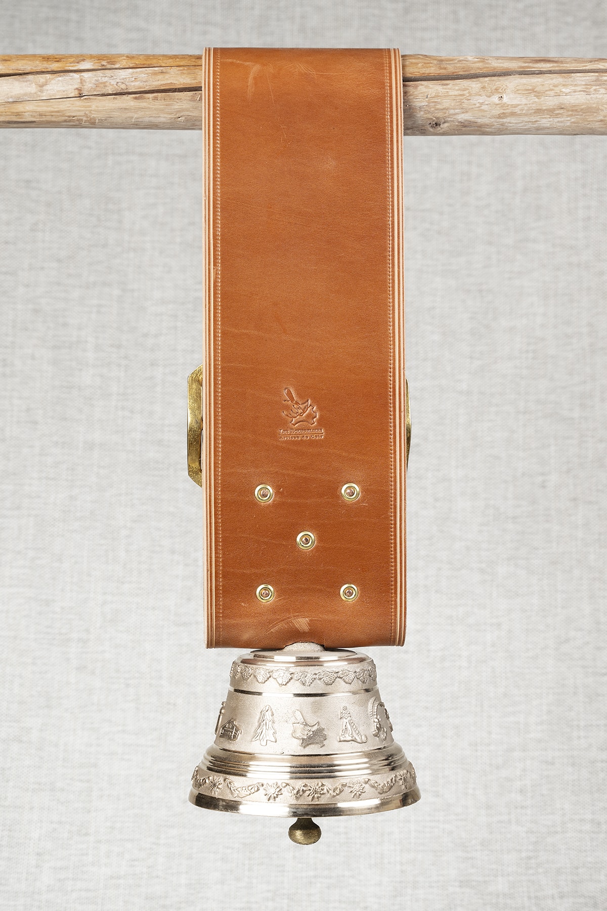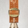 Cloche Bronze Ø 18,5 cm Hauteur: 12,5 cm. Boucle laiton de 16 cm de large et son collier en cuir de bourrellerie en tannage végétal d’une épaisseur de 0,5 cm et de couleur noisette.